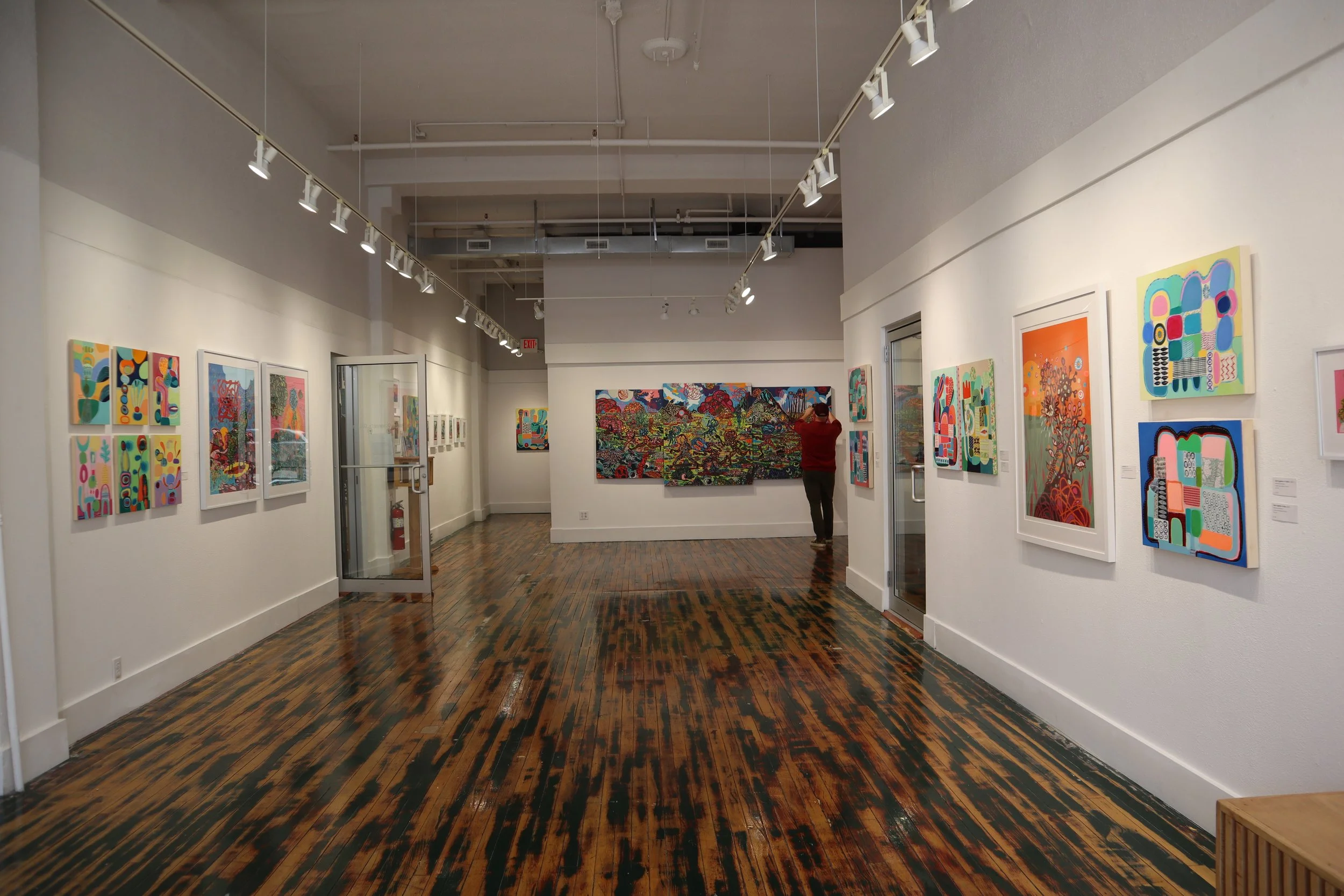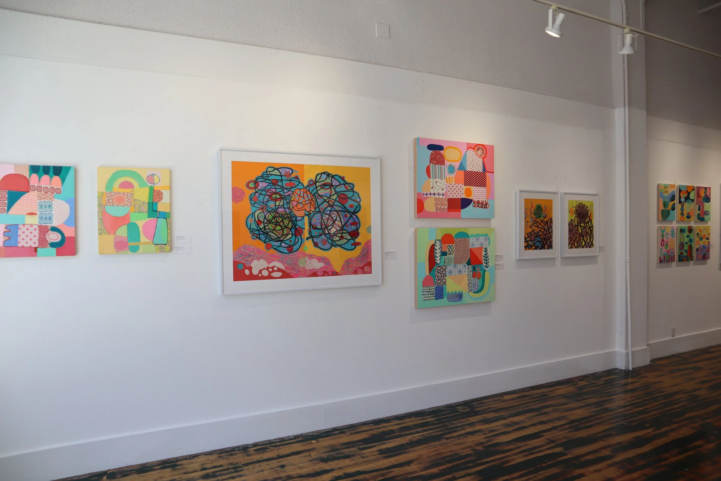 Although we express ourselves differently in style and subject matter, we share a common sense of playfulness, an obsession with color, and a process that is mostly intuitive - rather than planned. We both create unique worlds; layered dreamscapes that continue to reveal themselves in unpredictable ways.